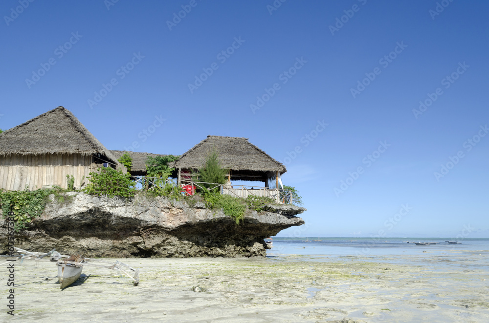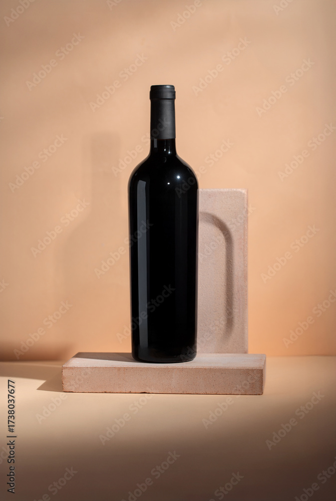Red wine bottle mockup displayed on a minimalist stone base against a soft peach background, showcasing elegant design and modern aesthetics for branding and marketing purposes