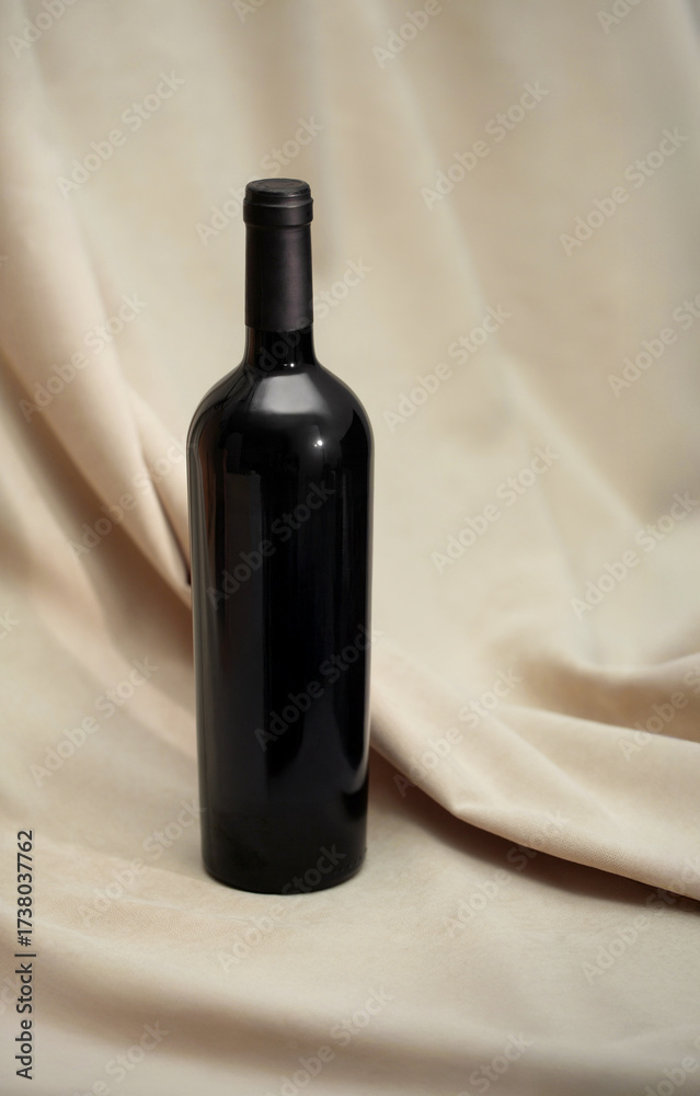 Red Wine bottle mockup displayed on soft beige fabric, showcasing elegant curves and glossy finish, ideal for branding and product presentation with copy space