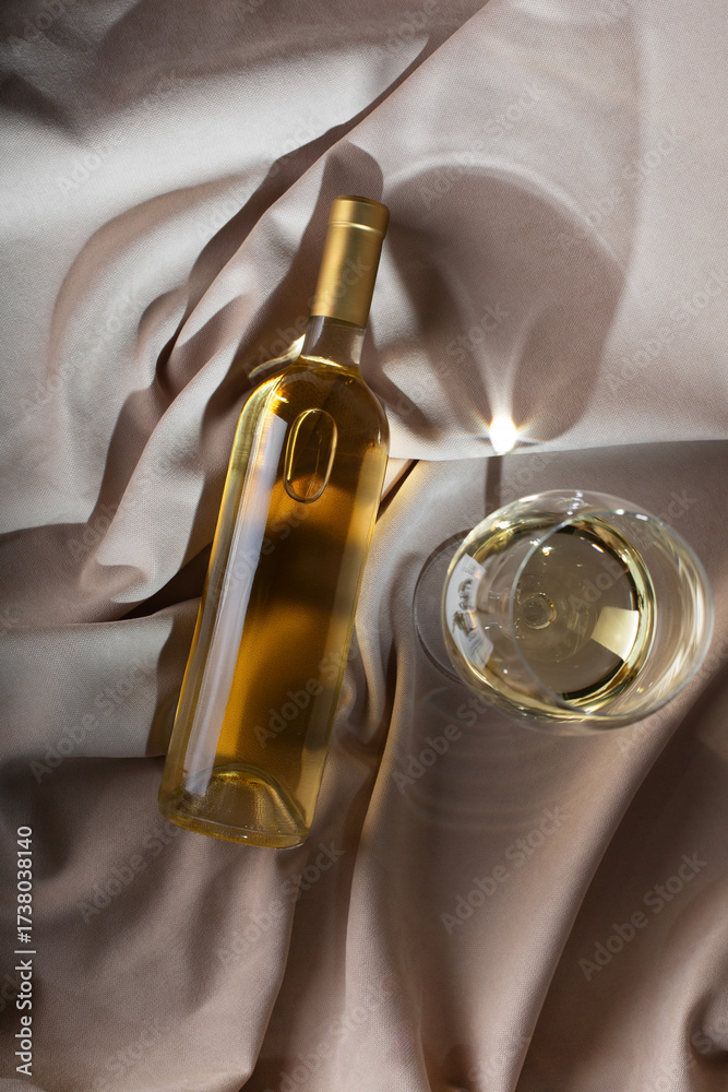 White wine bottle mockup with glass on elegant satin fabric, showcasing luxurious textures and soft lighting for sophisticated branding and design concepts