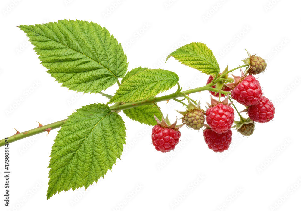 Isolated raspberries on stem with leaves, close-up of fresh red berry fruit still on the plant