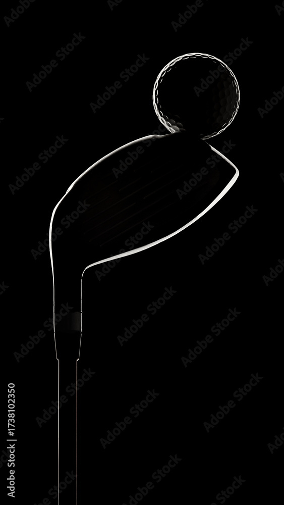 Golf ball on club head in dramatic silhouette on black background. Concept of sports advertising, minimal design visuals, premium golf branding and tournament promotions.