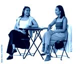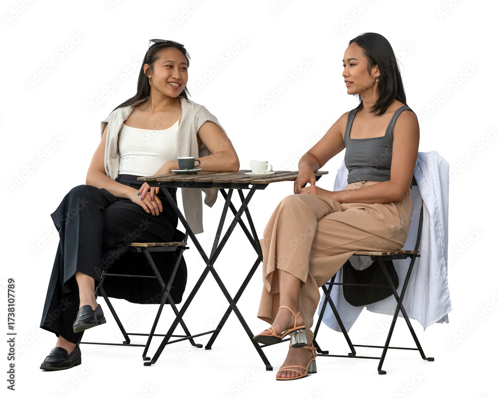 Two young Vietnamese women sitting in a cafeteria and talking, isolated on white and transparent background