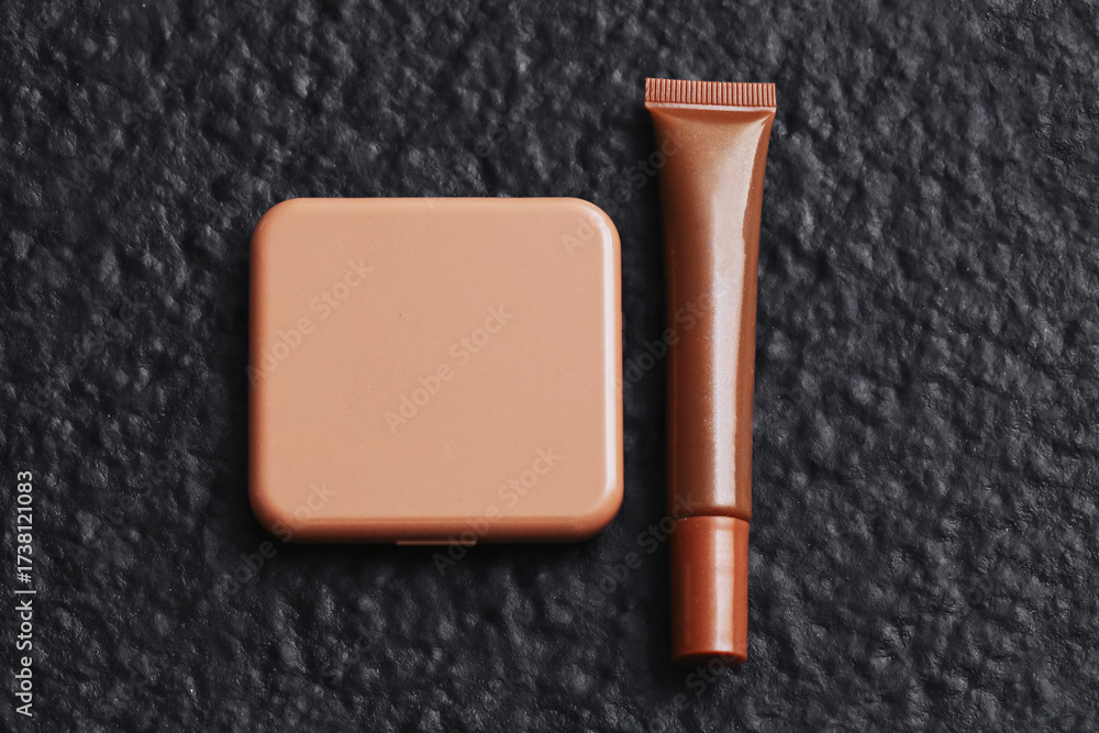 Cosmetic compact and cream tube. Modern beauty products on dark textured background. Minimalist square case and skincare container. Professional makeup and skincare accessories concept.