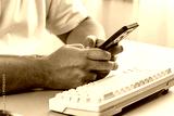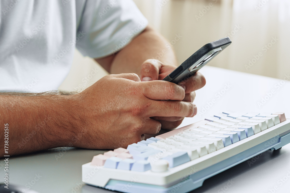 Person using smartphone while sitting at desk with mechanical keyboard in modern workspace