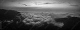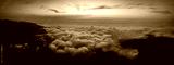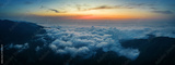 Breathtaking panoramic scene with mountain ranges rising above a vast expanse of mist under a vibrant sky.