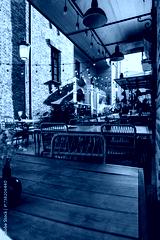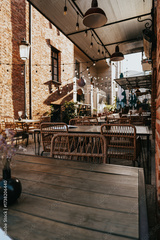 Cozy outdoor dining area with rustic decor and warm atmosphere in the late afternoon