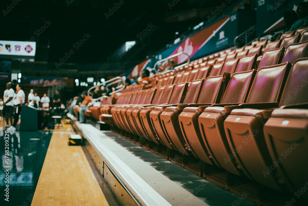 Indoor basketball stadium with children and adults on court. Red bleachers host diverse audience while cones and drills suggest structured athletic development in well-lit gym in Dallas, Texas