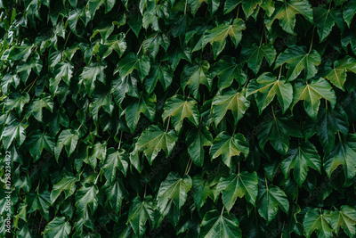 Lush green ivy leaves covering a wall in an urban garden during a sunny afternoon