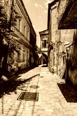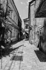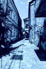 Charming cobblestone alleyway in a historic neighborhood under a bright blue sky