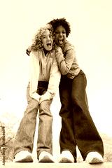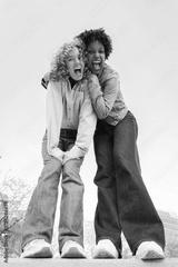 Two exuberant friends sharing a lively and enthusiastic moment filled with joy and laughter, embodying the essence of friendship and happiness in a delightful interaction that radiates energy.