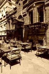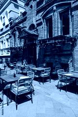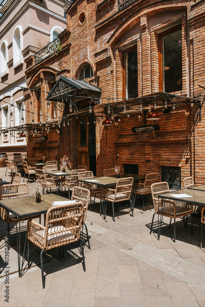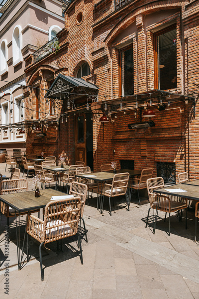 Outdoor dining area with stylish furniture in a historic building on a sunny day in a lively city