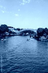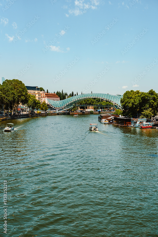 Scenic view of a modern bridge over a river with boats in motion on a sunny day in Tbilisi, Georgia