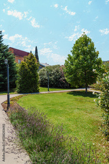 Lush garden with well-maintained grass and trees on a sunny day in a serene park setting