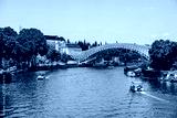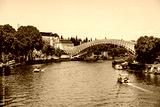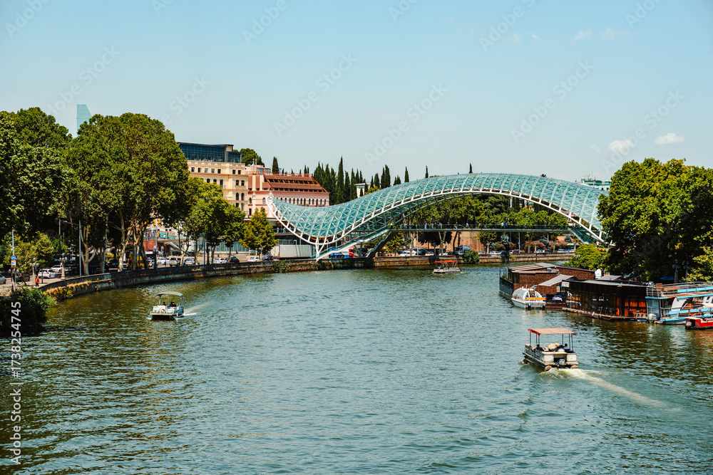 Beautiful view of a modern bridge over a river in Tbilisi with boats and greenery in the background during a sunny day