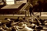 Young athletes perform stretching and core exercises on a running track, guided by an instructor, with stadium seating in the background.