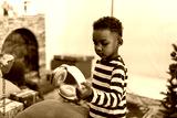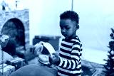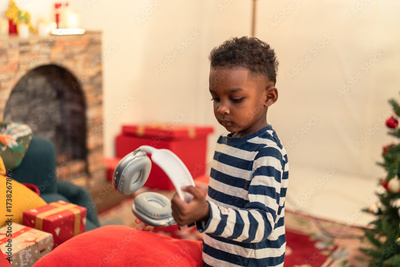 A cute African American boy standing and holding stuff in the living room with decoration background. The curiosity and innocence of a child on Christmas holiday.