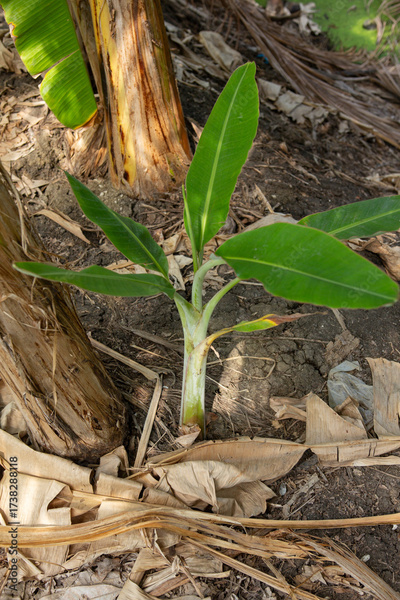 Close-up of a young banana plant sprouting from a rhizome, surrounded by dried banana leaves on the ground. The image highlights new growth, natural agriculture, and tropical farming.