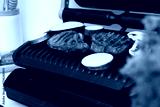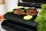 Electric grill with tasty meat, vegetables and mushrooms on table, closeup