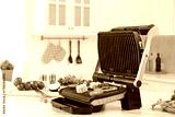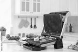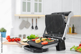 Electric grill with tasty meat and vegetables on white marble table in kitchen