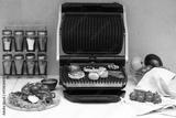 Electric grill with tasty meat, vegetables and spices on white countertop indoors