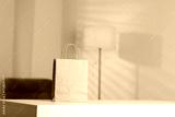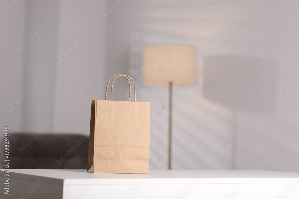 Paper shopping bag on white table indoors. Space for text