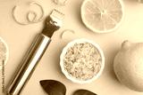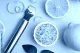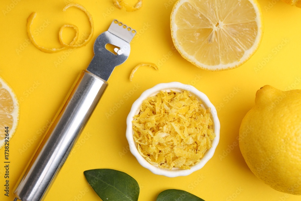 Lemon zest in bowl, fresh fruits, zester tool and green leaves on yellow table, flat lay