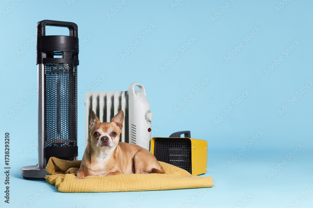 Cute little dog on blanket near electric heaters against light blue background, space for text