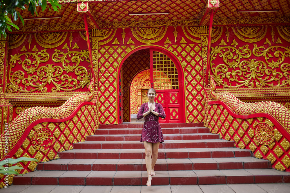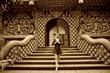 A Graceful Woman Posing in Traditional Attire at a Strikingly Decorated Red Temple Entrance with Intricate Golden Details and Elaborate Staircase Design
