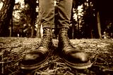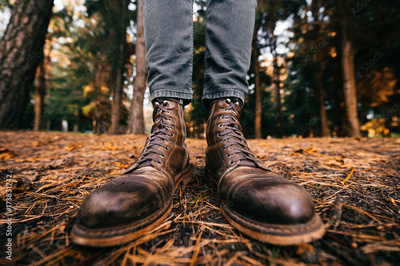 Man`s legs in woodcutter vintage leather boots and cropped jeans standing in autumn forest on ground. Fall colors and mood concept. Comfortable shoes. Walking on weekend on nature. Lens distortion.