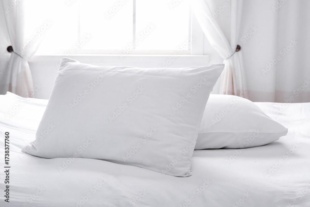 Modern bed with soft pillows near window