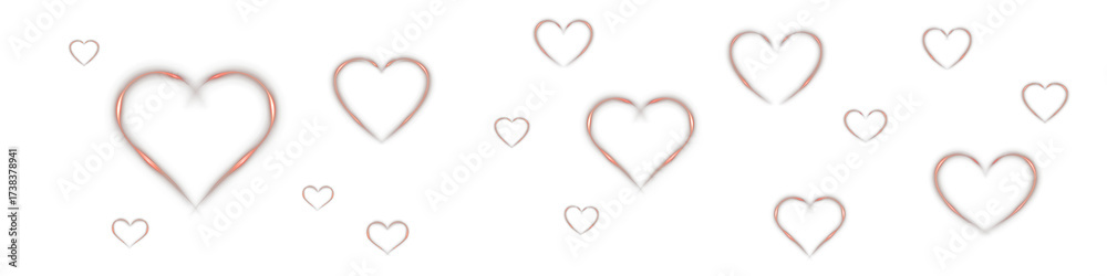 Neon glowing red hearts with sparkle dust luminous effect on transparent background. Romantic shiny symbols for love celebration, Valentine’s holiday decoration, wedding, and party banners.