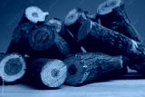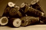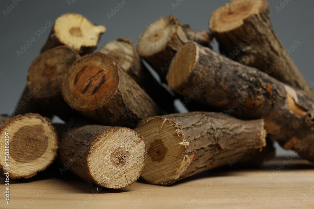 Pile of cut firewood on wooden table against grey background, closeup