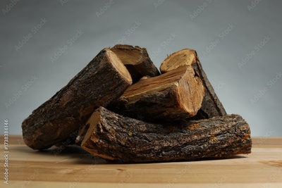 Pile of cut firewood on wooden table against grey background