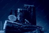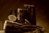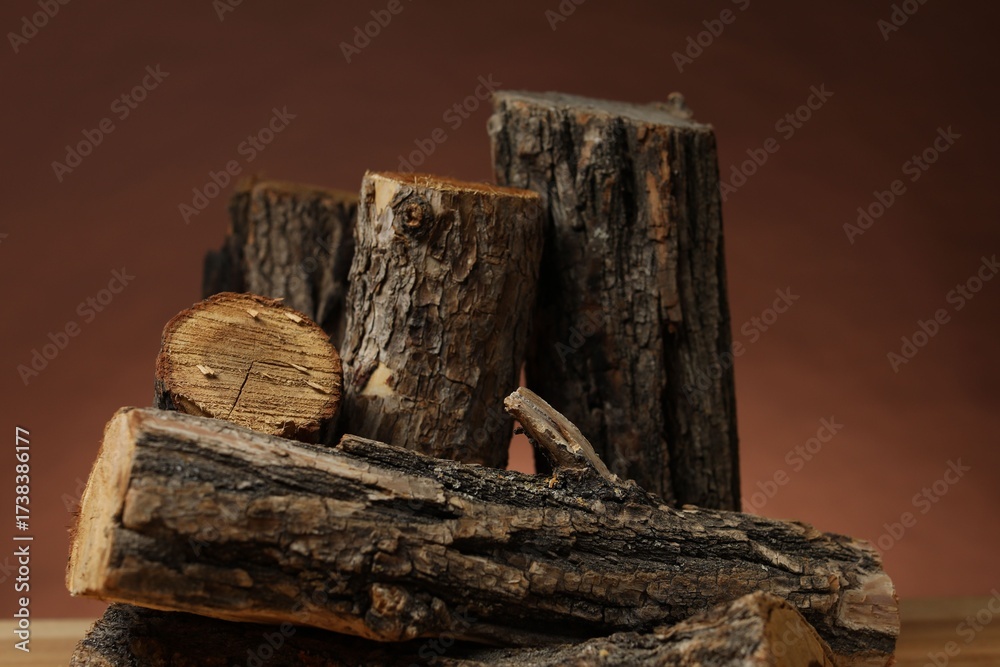 Pile of cut firewood on table against brown background, closeup