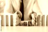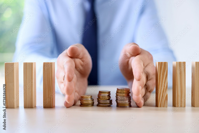 Risk. Man stopping domino effect to protect coins at table, closeup