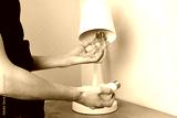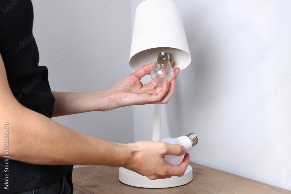 Woman changing light bulb in lamp near grey wall at wooden chest of drawers indoors, closeup