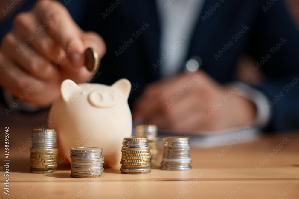Man putting coin into piggy bank at wooden table indoors, selective focus
