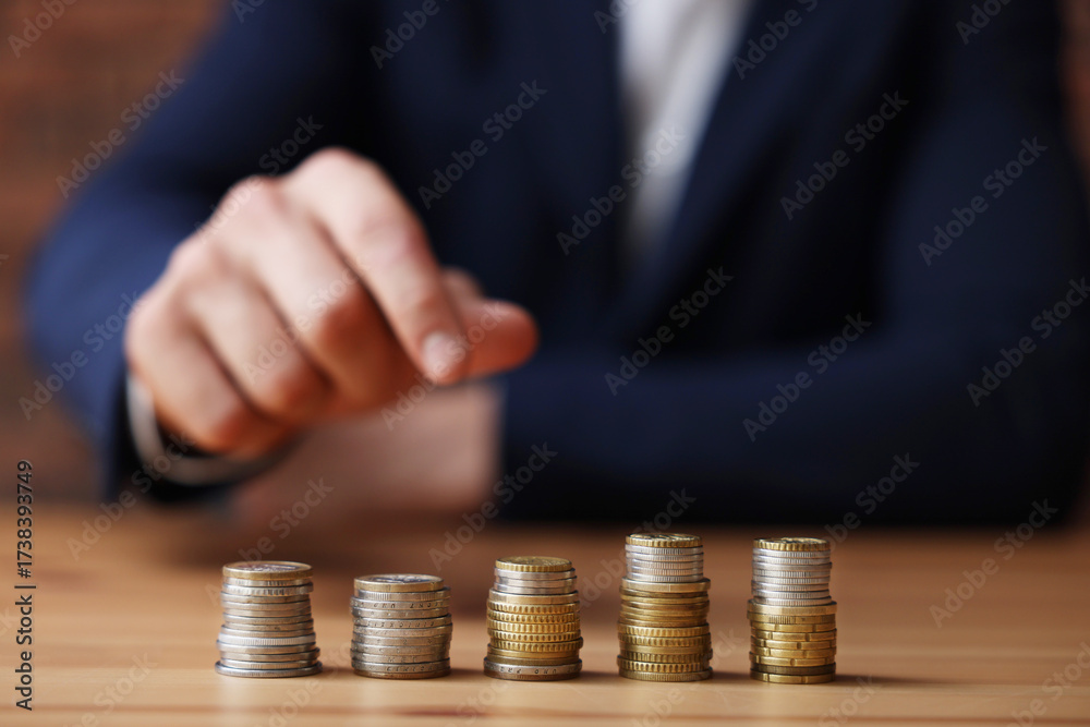 Man counting coins at wooden table indoors, selective focus