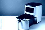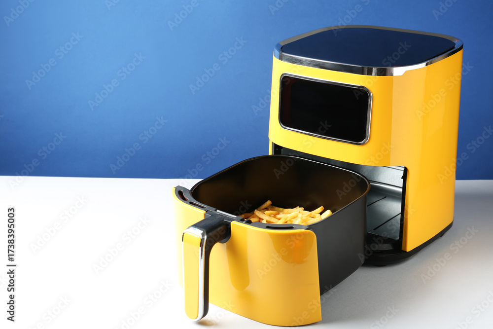 Air fryer with cooked fries on white table against blue background, closeup. Space for text