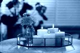 Tray with burning candles and beautiful flowers on wooden table indoors, closeup