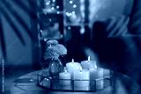 Tray with burning candles and beautiful flowers on wooden table indoors, closeup. Bokeh effect