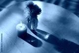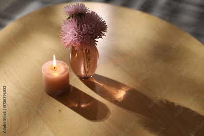 Burning candle and beautiful flowers on wooden table indoors, space for text