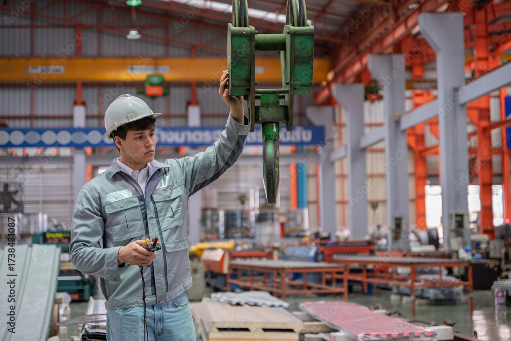Industrial worker operating overhead crane inside factory, wearing safety helmet and uniform, controlling heavy lifting equipment in manufacturing plant environment.
