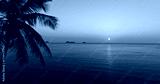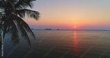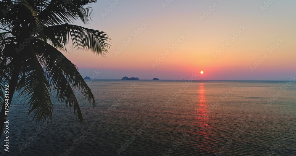 Beautiful sunset over the calm sea creating warm colors reflecting on the water surface with palm tree silhouette and islands on the horizon in Koh Samui, Thailand