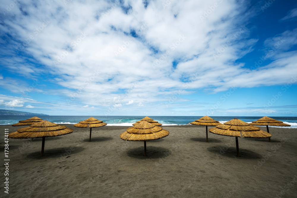 Santa Barbara Black volcanic sand beach with thatched umbrellas under a cloudy sky