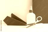 Glue, scissors and paper plane on white table against color background