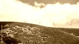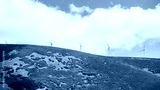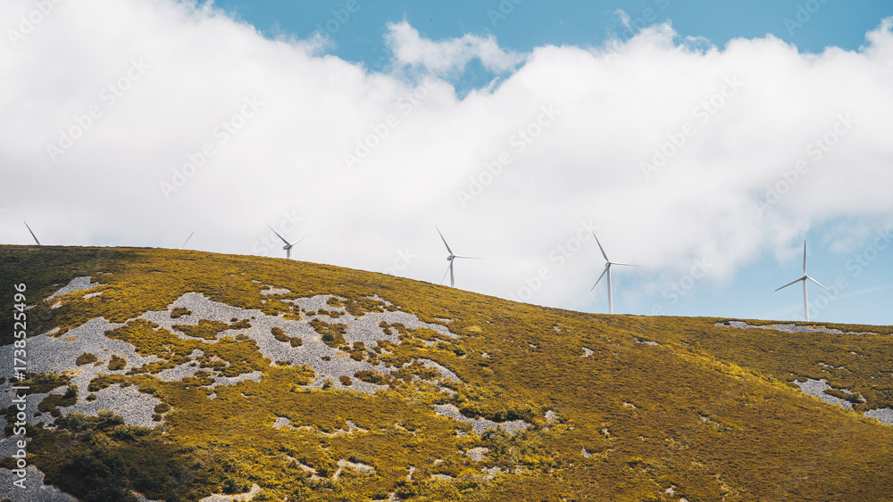 Row of wind turbines on a mountain ridge under a partly cloudy blue sky, blades turning above rocky slopes with golden vegetation. Clean energy and sustainable power in natural landscape