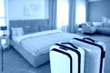 Spacious hotel room with comfortable furniture and guest suitcases, selective focus