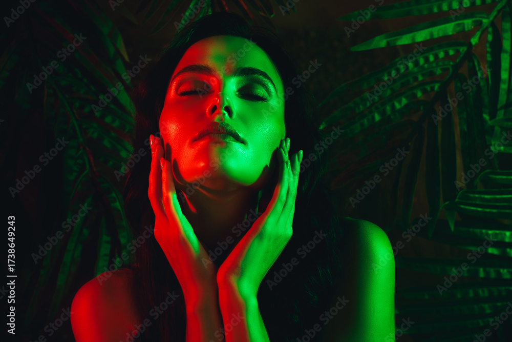 Artistic Portrait of a Beautiful Young Woman in Tropical Neon Ambiance with Rich Green and Red Tones