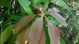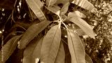 Vibrant green leaves of tropical plant in sunny outdoor view.